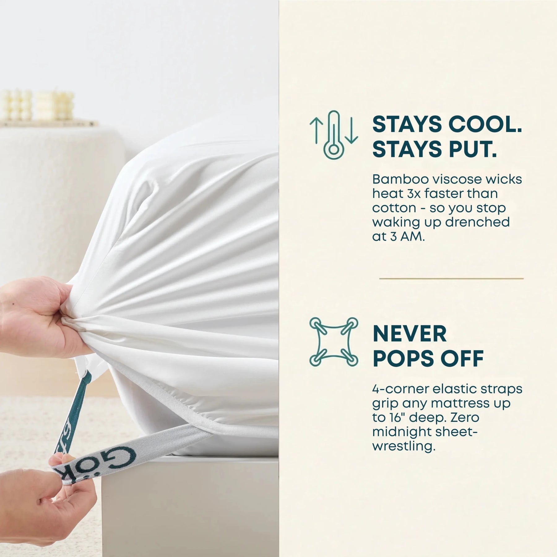 Our deep 16" pocket grips mattresses up to 18" thick — pillow-tops, memory foam, all of it. 4-corner elastic straps mean it stays put all night, every night. Zero midnight sheet-wrestling.